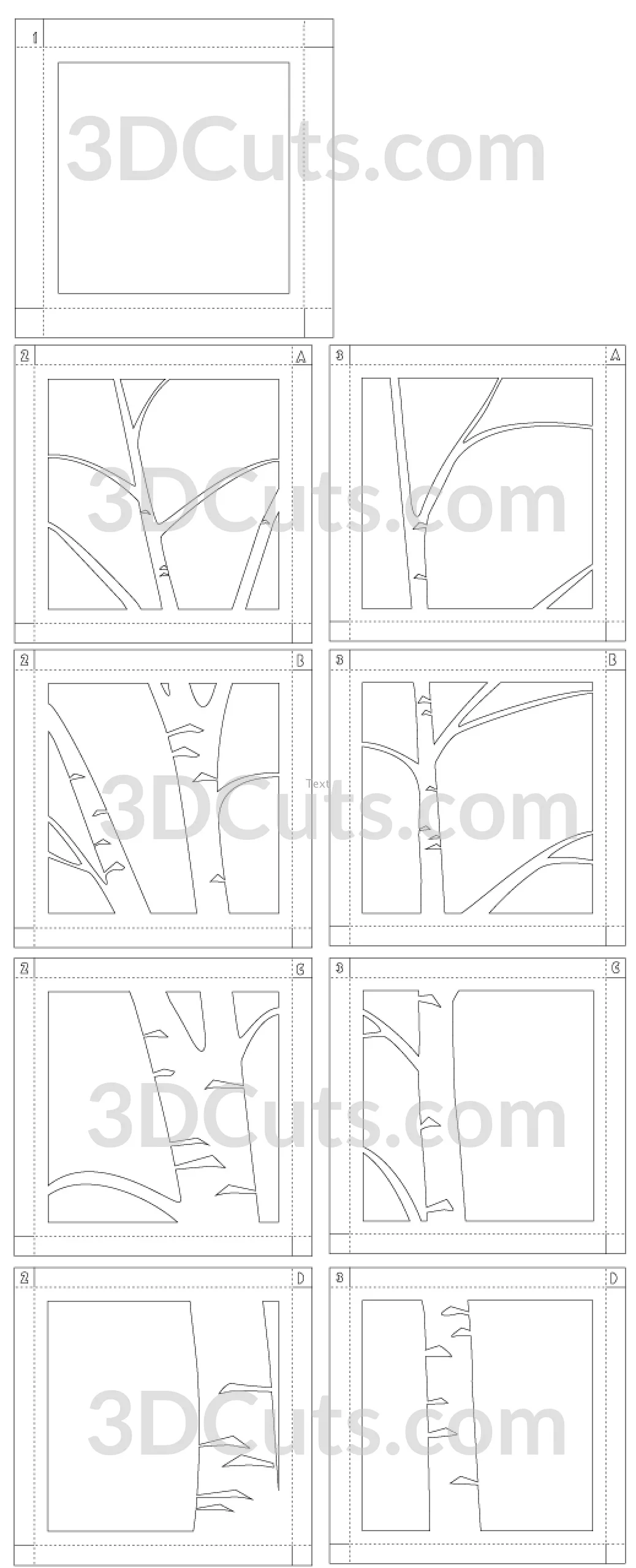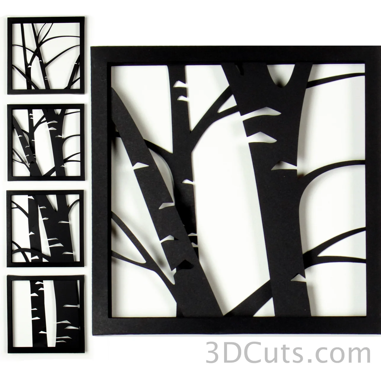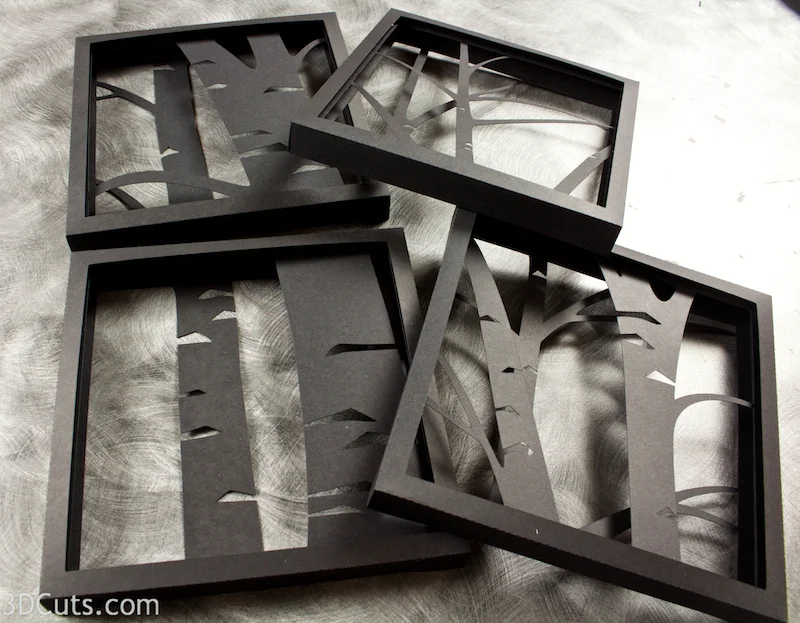 This tutorial is for creating the 4 section, 3 layer 3D aspen shadow box designed by Marji Roy of 3DCuts.com. It is constructed from card stock including the frames. It can be created with an open background to reveal the wall color behind or decorative papers can be added for a different effect. Here I show one example with a photo of a sky printed on an inkjet printer.