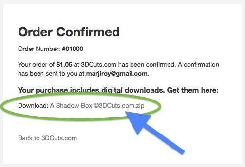 Order confirmed Message appears. Click on the Download file name. You will also get an email with a link to the digital file. It remains active for 24 hours. You must download the file within that time frame.