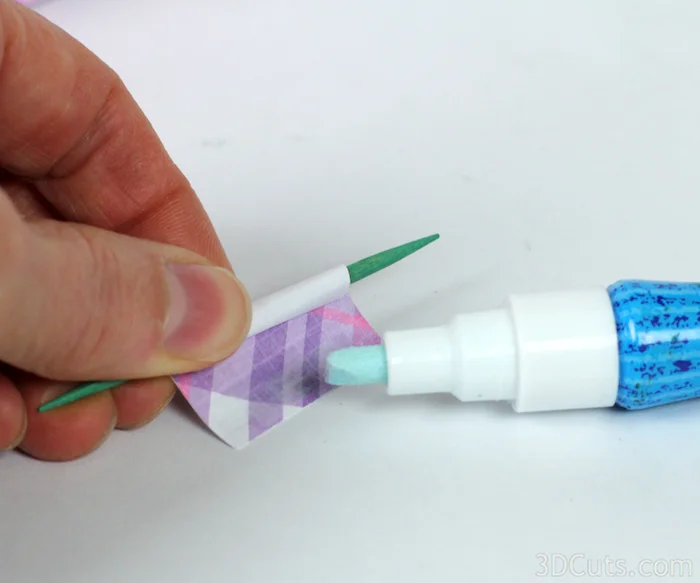 Take the small rectangle and wrap it tightly around a toothpick. It works best if this is cut from a lighter weight paper. Glue the outside edge. (But not the inside edge or it won't slide off!)
