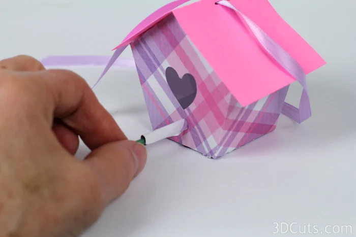 If your bird house is going to hang from a branch, now is the time to thread a ribbon in the slots on the roof.
