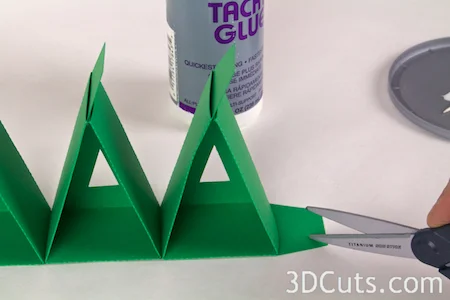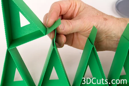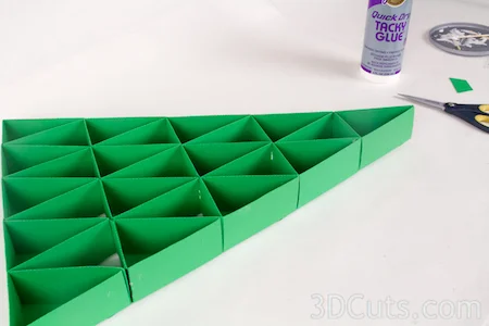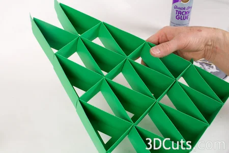 - The assembled tree is shown in the image. It has 5 green triangles on the bottom. It gains a lot of strength as the parts are glued together.