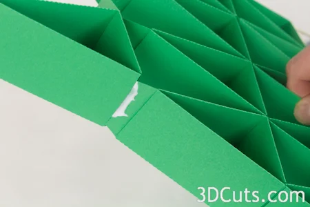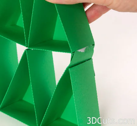 - Then glue the side tab to the tab sticking up from row one, add glue to that and slide it into the pocket on the base of the next triangle on row 2.