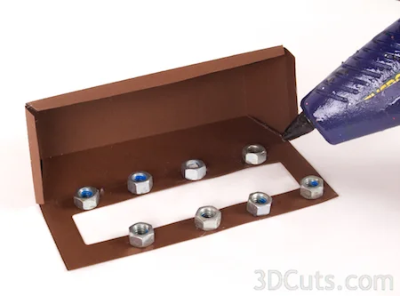- Hot Glue 8 nuts in an alternating pattern along the rim of the bottom.