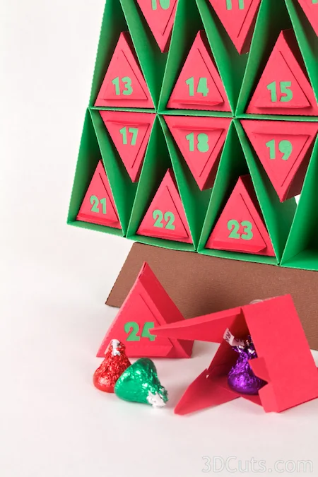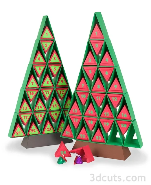 We all loved Advent calendars when we were young. Here is a new design built by making a triangular box 15 times and linking them together. The result is a graphically stunning yet truly functional Advent Calendar. Each tree triangle has a small one-piece box inserted to hide a treasure or Advent thought to help with the count down of days until Christmas.