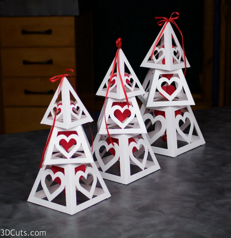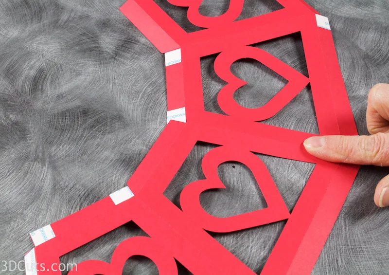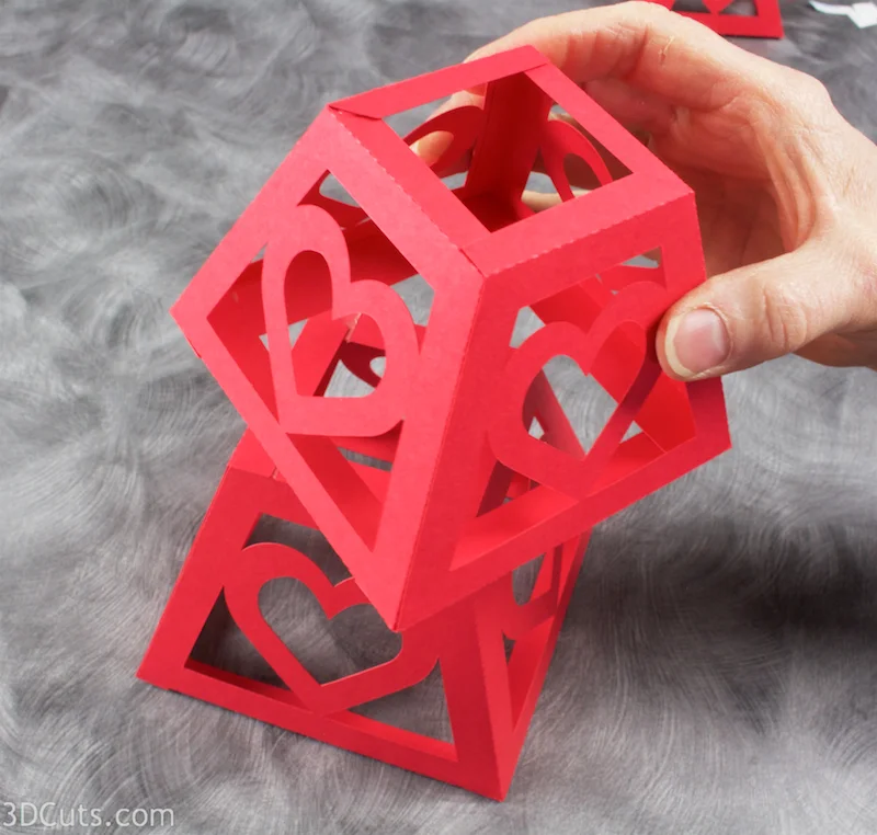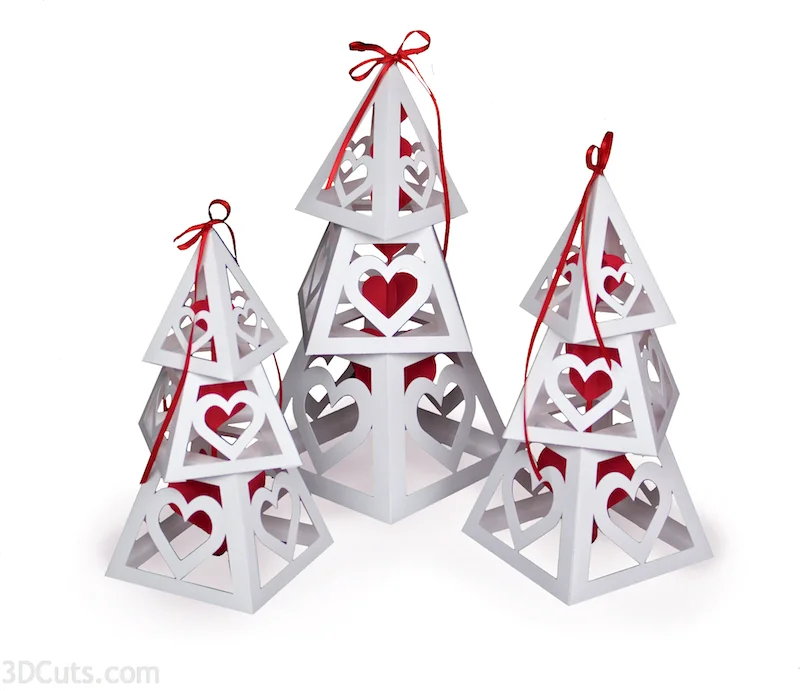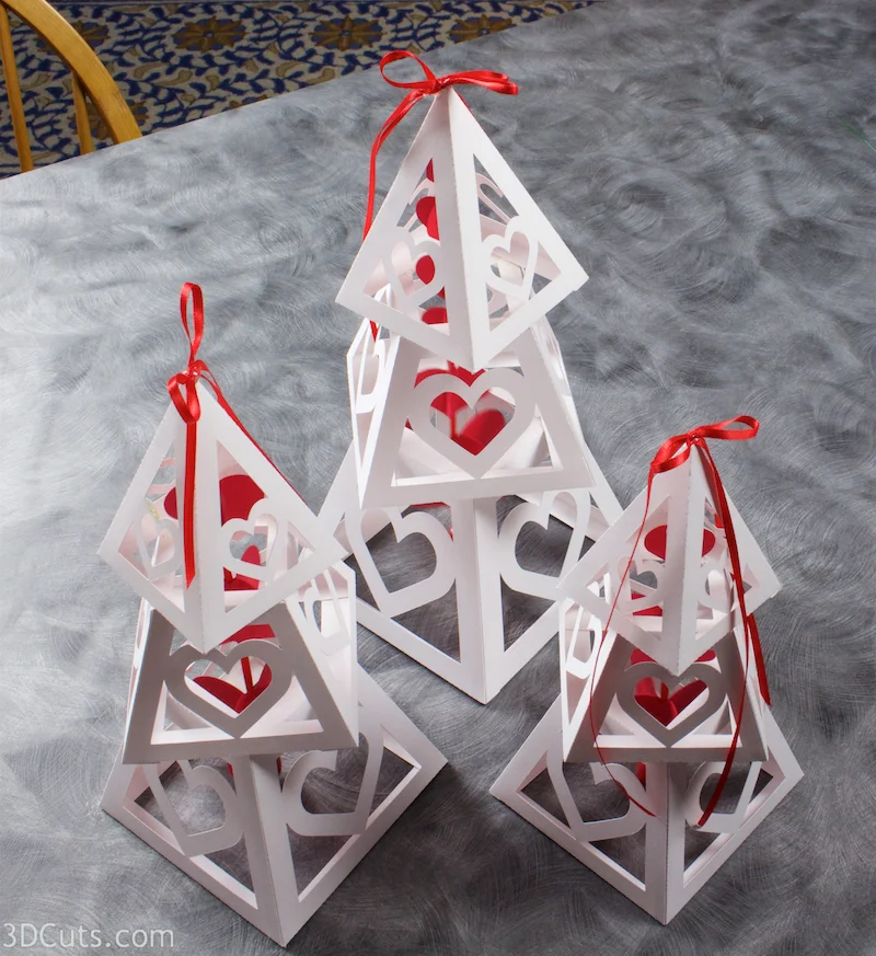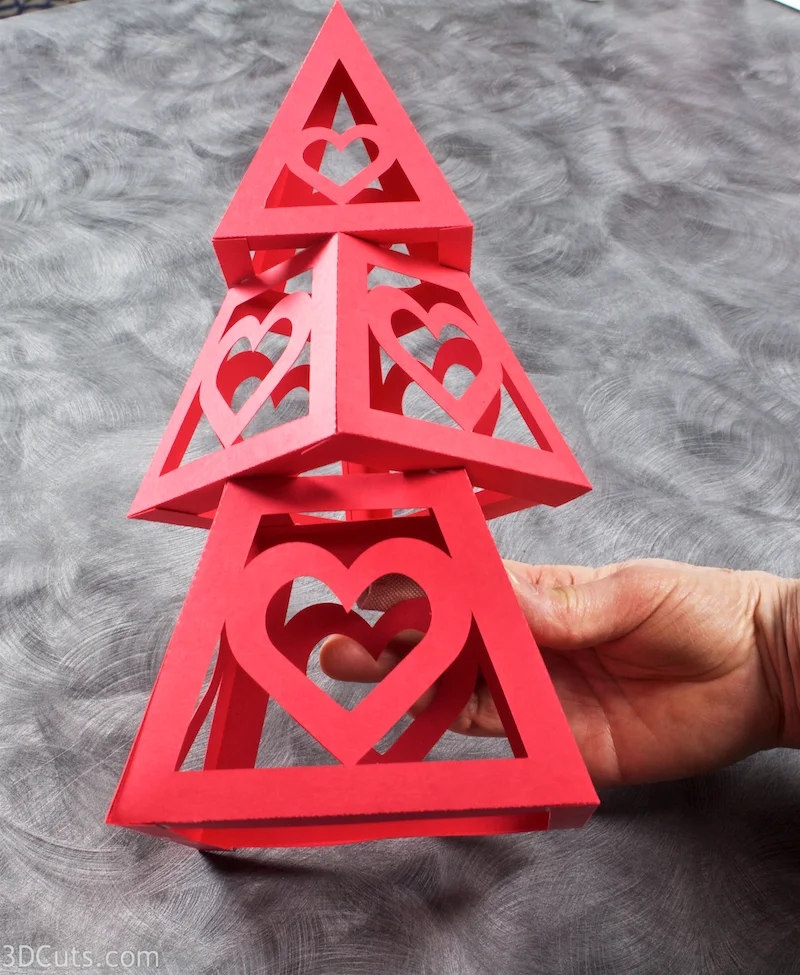 This tutorial is for the assembly of the Valentine Towers cutting files designed by Marji Roy of 3DCuts.com. It is a 3d sectional tower with heart cutouts surrounding an optional ribbon of hearts suspended in the center. This project is easy to assemble and a good beginner project for 3d paper work.
