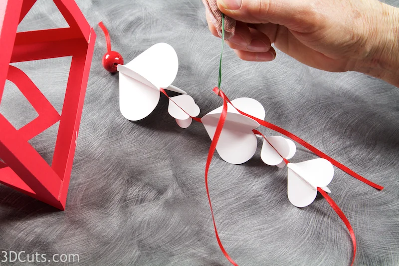 - Thread the ribbon onto the long wire needle and then thread that up through the center of the tower, and through the snipped hole on the top.